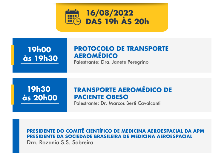 A Sociedade Brasileira de Medicina Aeroespacial (SBMA) realizará reunião científica on-line nesta terça-feira, 16 de agosto de 2022, das 19h00 às 20h00, horário de Brasília, sobre transporte aeromédico.