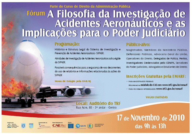No dia 17 de novembro de 2010 o SERIPA III e a EMARF (Escola de Magistratura Regional Federal) realizarão Fórum sobre “A Filosofia da Investigação de Acidentes Aeronáuticos e as Implicações para o Poder Judiciário” que ocorrerá no auditório do TRF, Rua Acre, 80, 3º andar, Centro, Rio de Janeiro, das 09 às 13h.