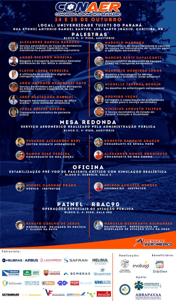 Paraná – Nos dias 24 e 25 de outubro de 2019 acontecerá o Congresso Aeromédico Brasileiro (CONAER), na cidade de Curitiba, PR. As palestras, oficinas e painel acontecerão no período das 08h00 às 19h00 e haverá espaço de exposição de produtos e serviços de empresas do setor, de cursos da Universidade Tuiuti, além de poder visitar o Museu Aeroespacial Entre Nuvens e Estrelas.