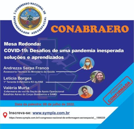 17h00 – História e atuação do enfermeiro de voo. Palestrante: Cel Antônio Gomes da Força Aérea Portuguesa.