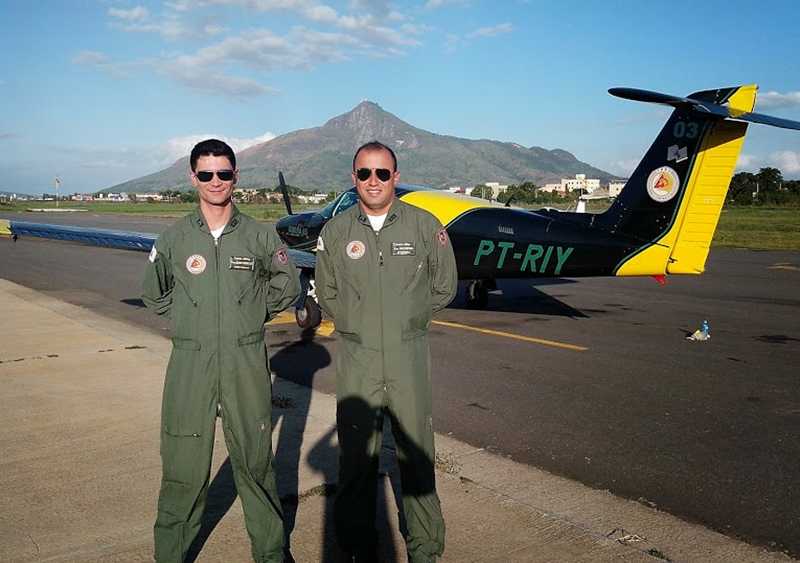 Logo após o pouso, a aeronave Guará 03, PT-RIY, avião modelo Embraer Corisco Super Turbo, pertencente à Secretaria de Meio Ambiente e Desenvolvimento Sustentável (SEMAD) e operado pela Polícia Militar, tripulado pelo Cmt da Aeronave 1º Ten PM Silvestre e pelo Comandante de Operações Aéreas 1º Ten PM Jean Carlos, decolou para realizar a segunda etapa do traslado do tecido até a cidade de Governador Valadares.