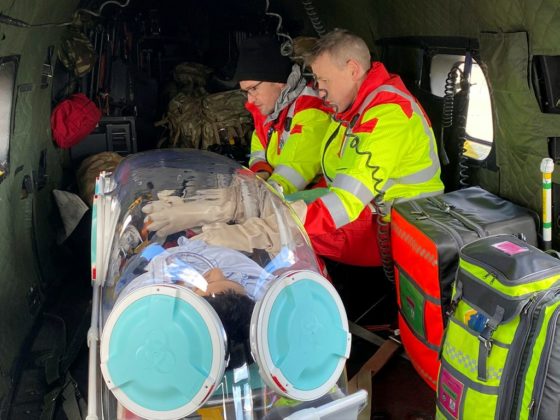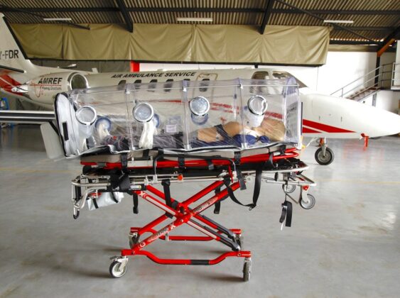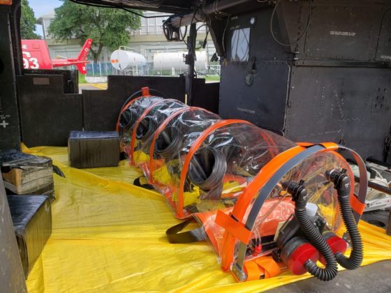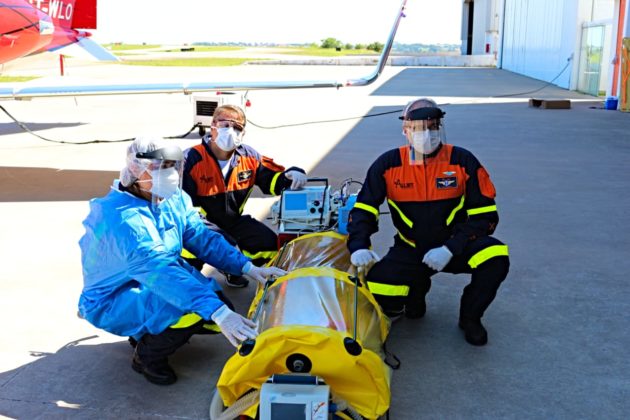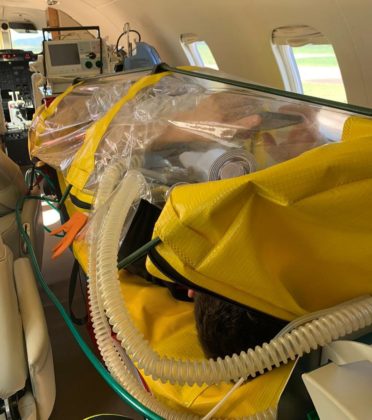 A segurança e a saúde do paciente são o foco principal no transporte aeromédico, mas é igualmente importante que a equipe de saúde seja protegida. A maioria das unidades de isolamento para um único paciente é equipada com ventiladores que criam uma pressão negativa dentro da unidade, ajudando a garantir que não haja transmissão de patógenos perigosos no caso de uma pequena ruptura.