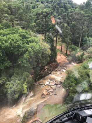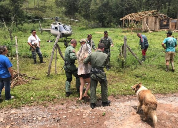 Santa Catarina – A forte chuva que caiu no município de Rio Rufino, na Serra Catarinense, deixou um casal isolado. Isso porque, a enxurrada derrubou as pontes e eles precisaram ser resgatados pelo helicóptero Águia 4 da 5ª Companhia do Batalhão de Aviação, na manhã de sábado (11).