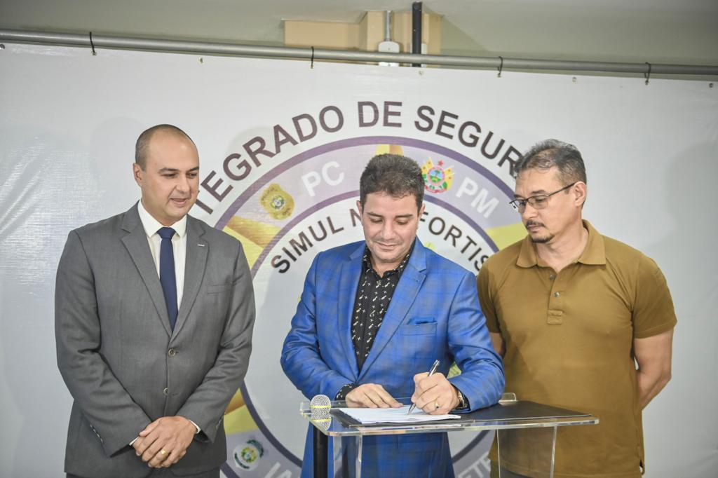 Governador Gladson Cameli assina ordem de aquisição de um novo helicóptero para o Ciopaer, ao lado do titular da Sejusp, coronel Paulo Cézar Rocha dos Santos e o gerente de vendas governamentais da Helibrás/Airbus, Leonardo Antônio da Silva. Foto: Diego Gurgel/Secom.