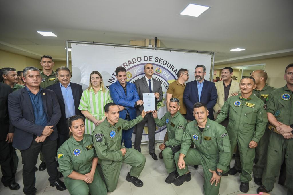 Governador Gladson Cameli, ao centro, com o executivo da Helibrás, Leonardo Antônio da Silva, o deputado federal e senador-eleito Alan Rick, os coronéis Negreiros e Samir, o secretário da Sejusp, coronel Paulo Cézar Rocha dos Santos, o coronel e deputado federal eleito Ulysses Araújo e a secretária-adjunta da Sejusp, delegada Márdhia El-Shawwa Pereira. Foto: Diego Gurgel/Secom.
