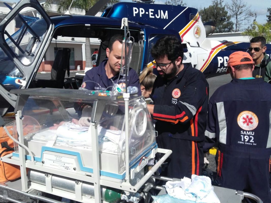 Helicóptero Guará 02 transportando o bebê prematuro em conjunto com o SAMU. Foto: Divulgação.