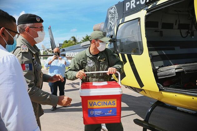 Alagoas recebeu lote com mais de 70 mil doses e os helicópteros da Segurança Pública do Estado também foram utilizados para a distribuição das vacinas. O médico do Serviço de Atendimento Móvel de Urgência (SAMU) Reginaldo Melo, e que também integra a equipe de resgate do Falcão 05 do Grupamento Aéreo, foi um dos primeiros profissionais da saúde que recebeu uma dose da vacina.
