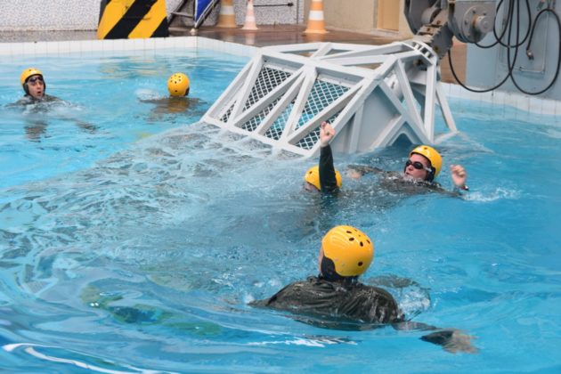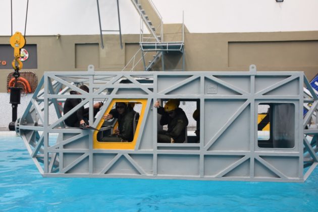 O módulo de treinamento usado pela Marinha do Brasil simula uma plataforma que, após o impacto com a água, submerge até cinco metros de profundidade, permanecendo de cabeça para baixo. É um treinamento essencial e técnico, em que os tripulantes precisam manter-se em apneia, aguardar a entrada da água e o completo afundamento do equipamento para, só então, se soltar e nadar até a superfície com tranquilidade.