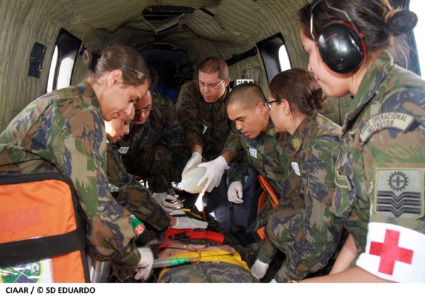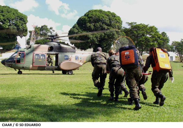 A operação simulou a evacuação de feridos em um cenário de conflito, no qual o embarque rápido e seguro das vítimas é crucial. Após o embarque, foi iniciada a simulação de avaliação médica especializada em voo, com foco na identificação de condições críticas que possam representar risco iminente à vida.