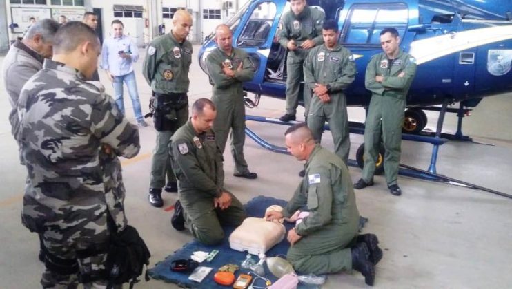 Operadores aerotáticos do Grupamento Aeromóvel da PM treinam técnicas de Suporte Básico de Vida. Foto: Divulgação.