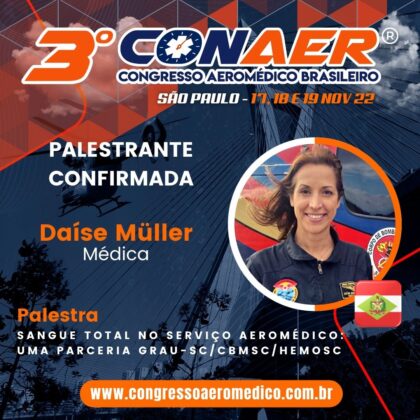Participarão do evento o médico Maurício Lemos da UAP SESA/SAMU PR com a palestra “Desafios do resgate aeromédico em rodovias: Do acionamento a intervenção“, a médica Daíse Esswein Müller do GRAU e SAMU SC com a palestra “Sangue total no serviço aeromédico: Uma parceria GRAU/CBMSC/HEMOSC” e o médico Felipe Novak da Helisul Aviação com a palestra “Modelo público-privado das operações aeromédicas no Estado do Paraná – Estudo de Caso“.