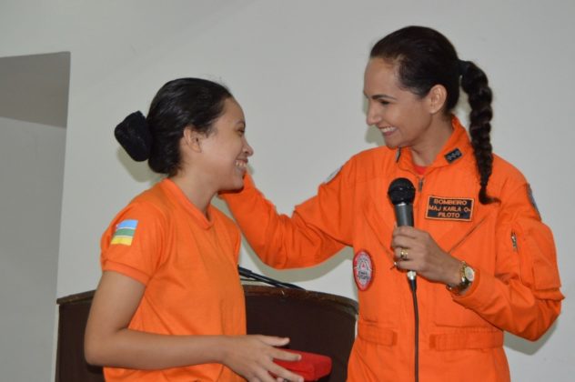 Na ocasião a piloto se emocionou ao receber uma homenagem especial da aluna da Escola, de ensino militar, Risalva Freitas do Amaral Elaine Rebeca, vencedora da etapa estadual do concurso internacional de redação dos correios.