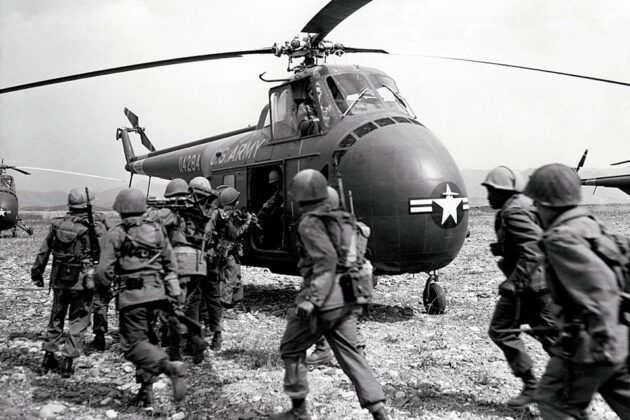 Tropas do Oitavo Exército dos EUA embarcam em um Sikorsky UH-19D da 6ª Companhia de Helicópteros de Transporte para uma viagem rápida até o front. O H-19 foi o primeiro helicóptero de transporte operacional do mundo. (Arquivos Nacionais)