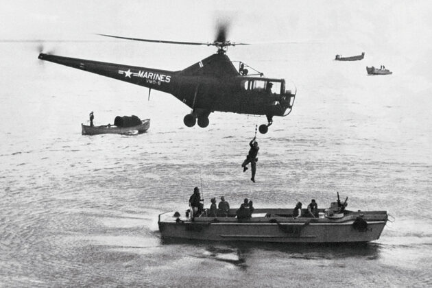 Um Sikorsky HO2S-1 transfere um fuzileiro naval de um LCVP (embarcação de desembarque, veículo, pessoal) para o navio de comando Mount McKinley durante o desembarque anfíbio em Inchon em 16 de setembro de 1951. (Bettmann / Corbis)