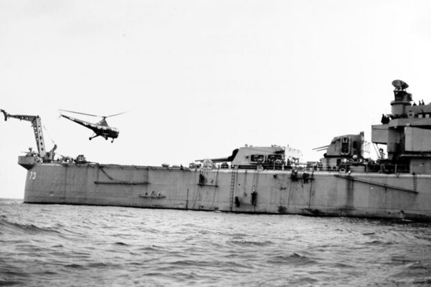 Um Sikorsky HO3S-1 pousa no convés posterior do USS Saint Paul após avistar tiros navais em Wonsan, na Coreia do Norte. (História Naval e Comando de Patrimônio)