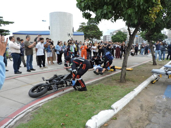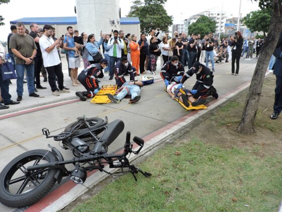 Espírito Santo – O Serviço de Atendimento Móvel de Urgência (SAMU 192) promoveu na sexta-feira (11), o Simulado de Incidente com Múltiplas Vítimas (IMV) e o resgate aéreo cujo cenário de prática envolveu, pela primeira vez, bicicletas elétricas, veículo de passeio, além do acionamento da equipe aeromédica do Núcleo de Operações e Transportes Aéreo (NOTAER). O simulado aconteceu na Orla de Camburi, em Vitória.