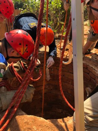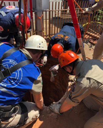 Socorristas do SAMU e do Corpo de Bombeiros resgatam homem que caiu em fossa, em Terra Boa, PR