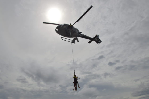 Helicóptero do GRAER da Polícia Militar da Bahia resgata homem que ficou à deriva no mar de Stella Maris. Foto: Divulgação SSP