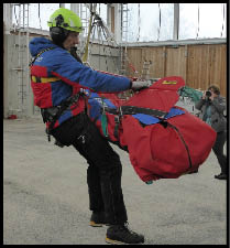Um tripulante de resgate demonstra o estabilizador fixado à maca de resgate para opor-se ao efeito de giro quando a maca está no ar. Foto: Andrew Drwiega