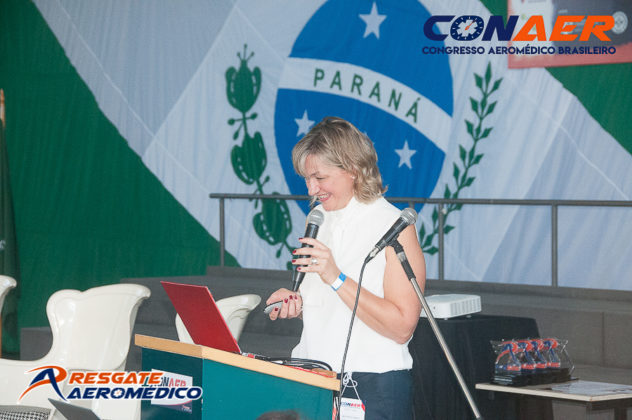 A primeira palestra do dia 24, com apoio da Airbus/Helibras, foi apresentada pela Dra. Cristina Carriedo Scher, Diretora Médica na Gerência de Urgências, Emergências e Transporte Sanitário do Serviço de Saúde de Castilla-La Mancha, Espanha.