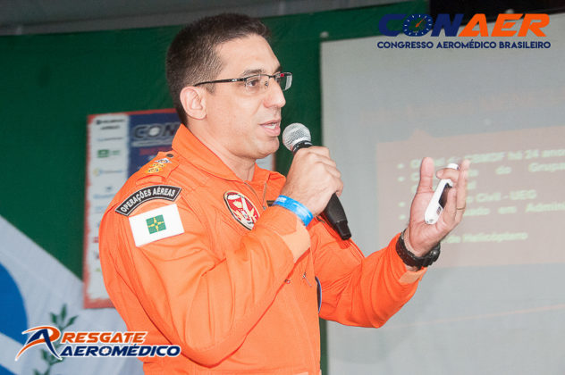 Em seguida tivemos a apresentação do serviço aeromédico do Corpo de Bombeiros do Distrito Federal e a experiência do voo noturno e do atendimento a parada cardiorrespiratória, com a participação do Ten Cel BM Menegassi e do Maj Med Alexandre.