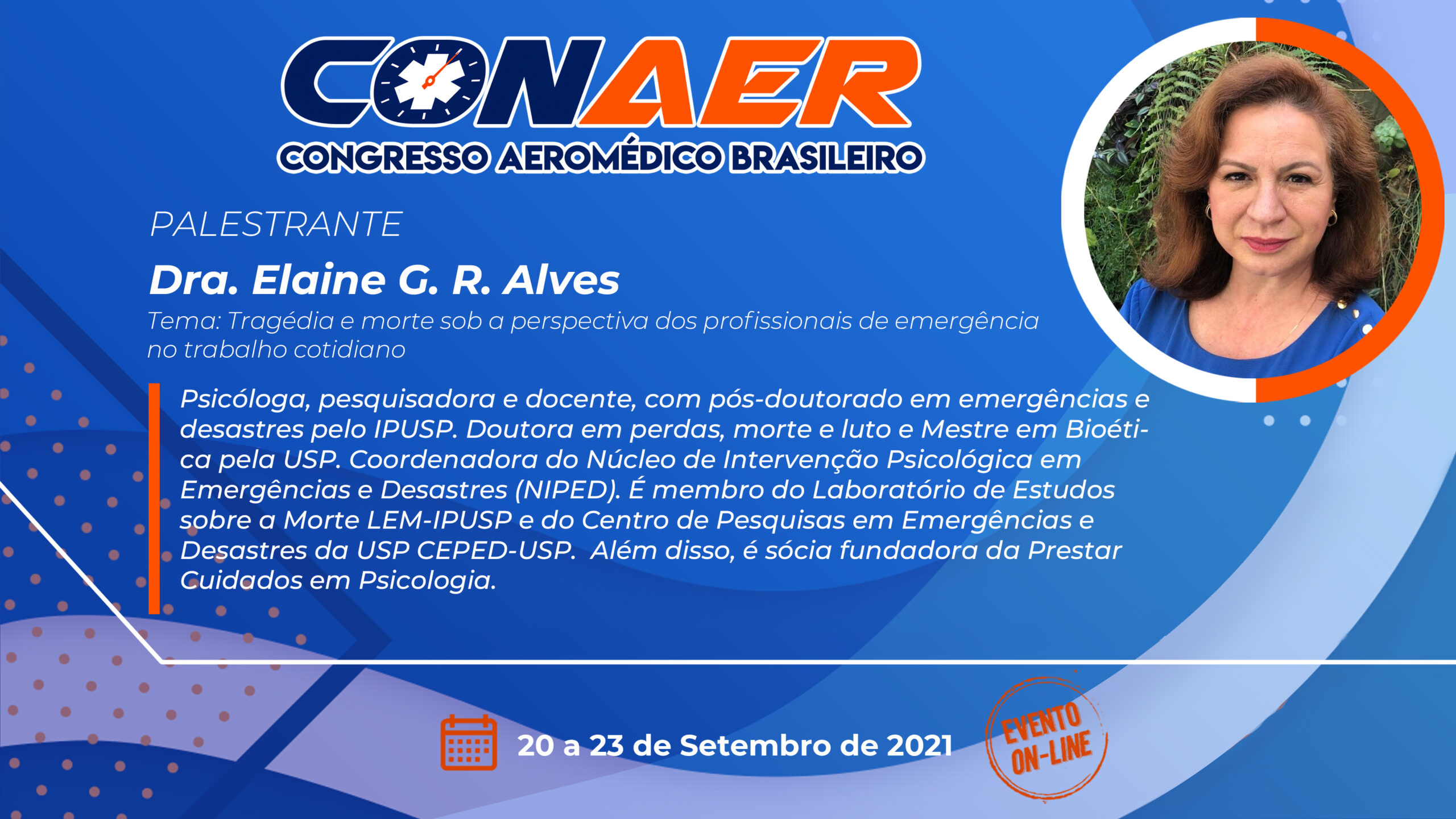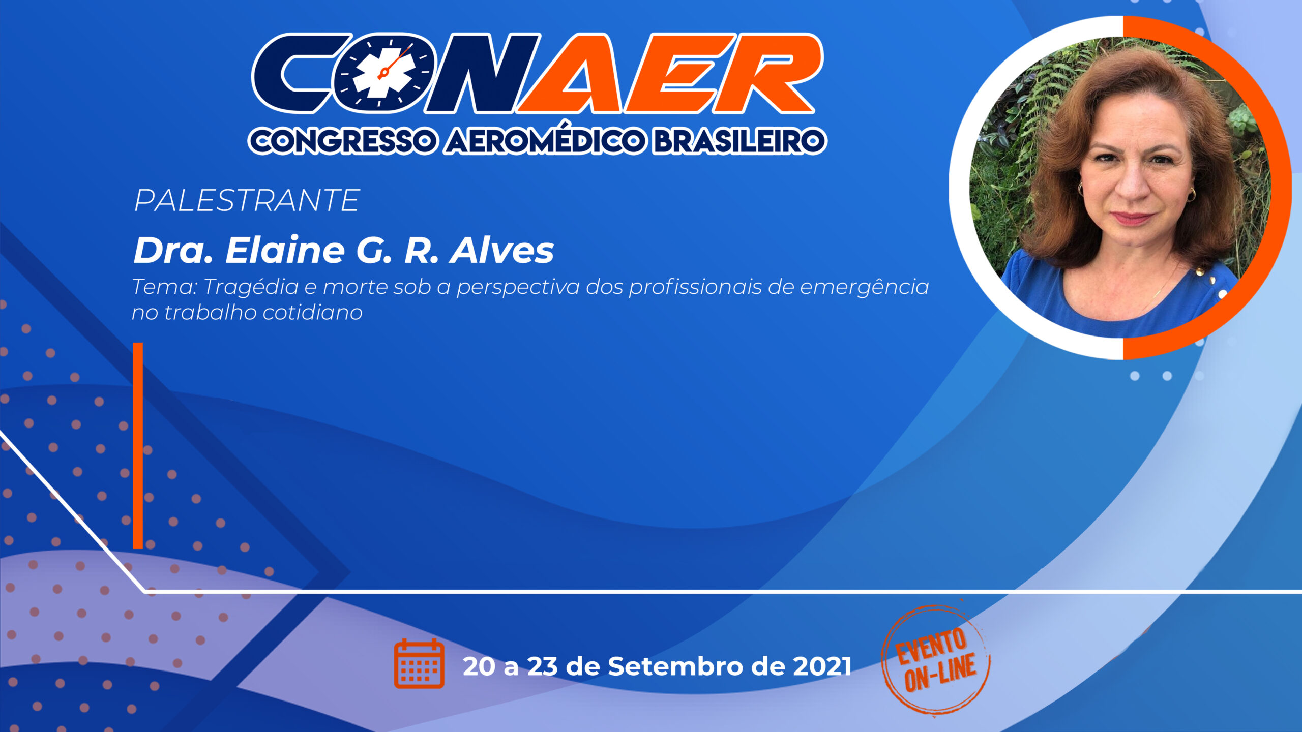Durante a programação do 2º CONAER, os participantes terão a oportunidade de assistir palestra da Dra. Elaine G. R. Alves. O tema será Tragédia e morte sob a perspectiva dos profissionais de emergência no trabalho cotidiano.
