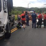 A colisão aconteceu por volta das 7h de domingo (06) no quilômetro 10 da rodovia. O caminhoneiro não se feriu. O motorista do carro, no entanto, estava preso nas ferragens e apresentava fratura exposta de um braço e fratura de fêmur. O passageiro, por sua vez, apresentava escoriações, mas estava consciente e orientado, com os sinais vitais normais.
