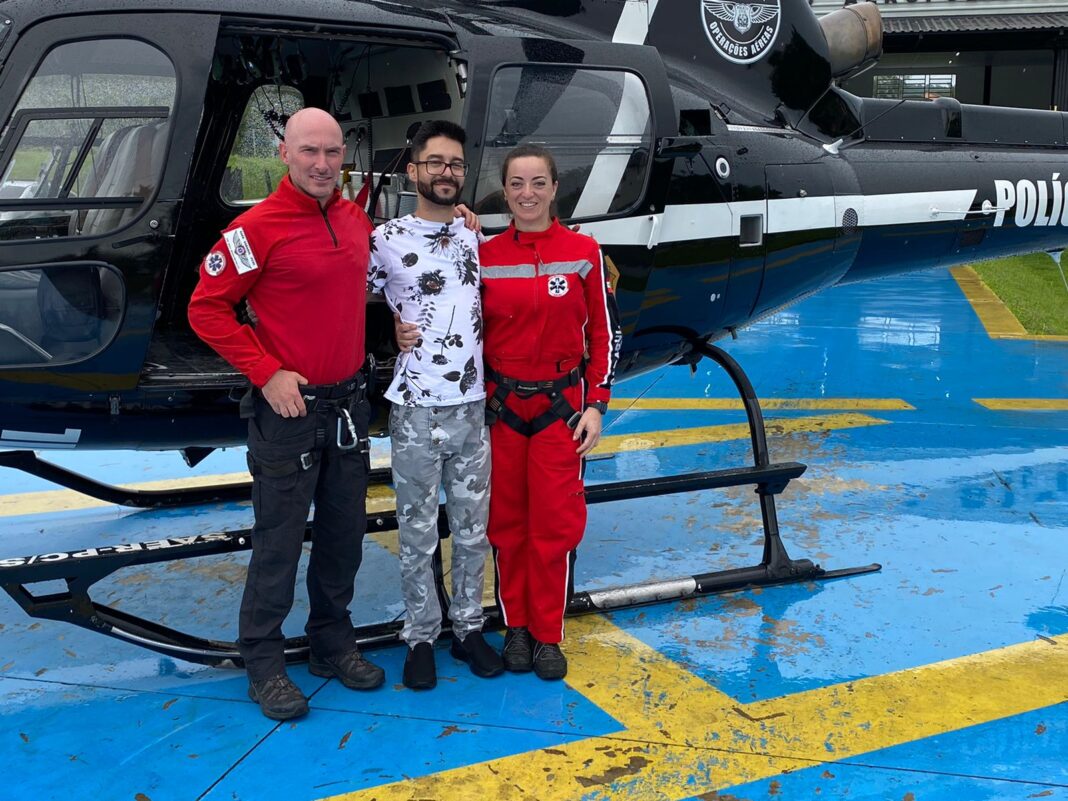 Na sequência, o serviço aeromédico SAER/SARASUL foi acionado e em 9 minutos estava no local do atendimento. Avaliado pela equipe, o paciente apresentava insuficiência respiratória e sinais de choque. Após a intervenção avançada da equipe aeromédica, o paciente foi conduzido de aeronave até Criciúma, onde foi encaminhado pela ambulância do SAMU até o hospital São José de Criciúma, onde ficou internado na UTI.